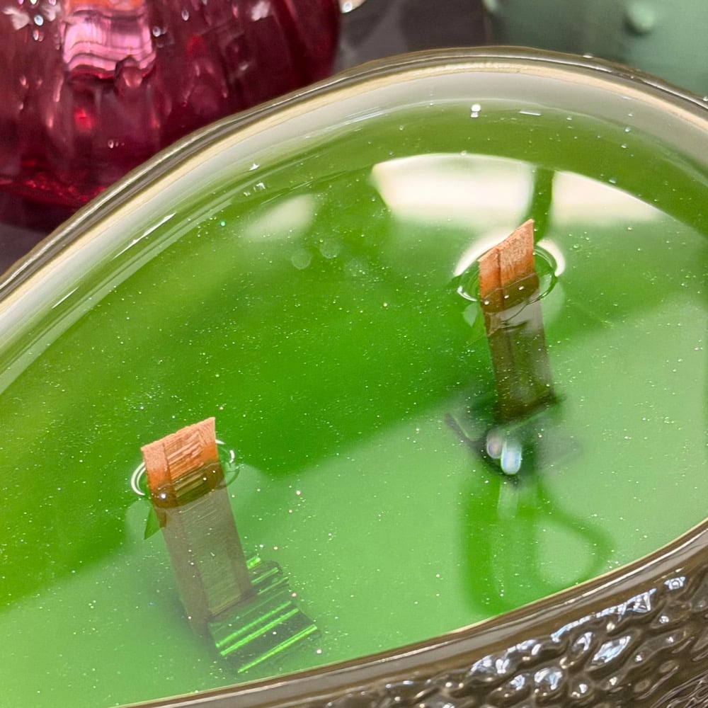 reusable and refillable container, clean burning coconut wax, crackling wood wicks, paraben + phthalate free fragrances, vegan
