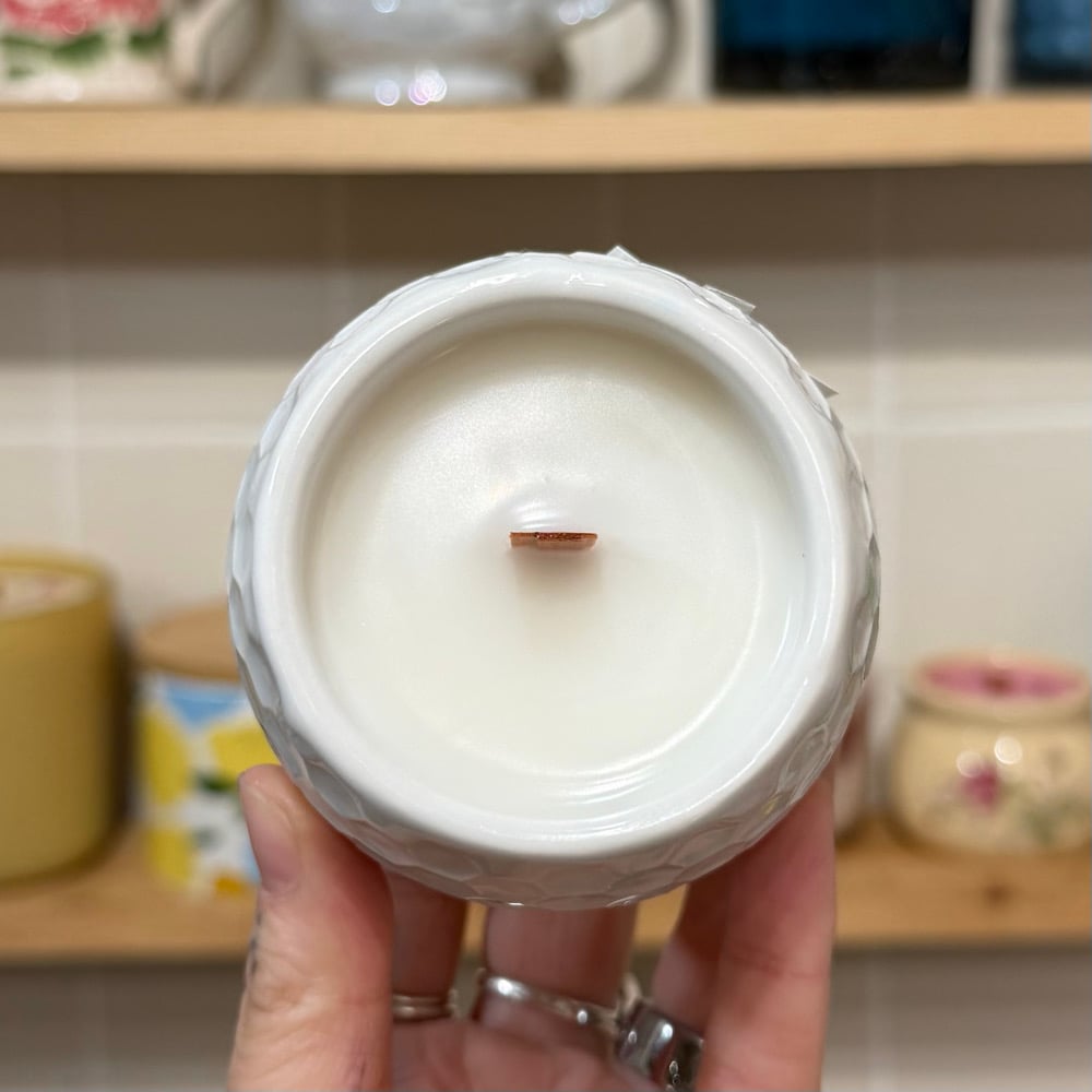 reusable and refillable container, clean burning coconut wax, crackling wood wicks, paraben + phthalate free fragrances, vegan